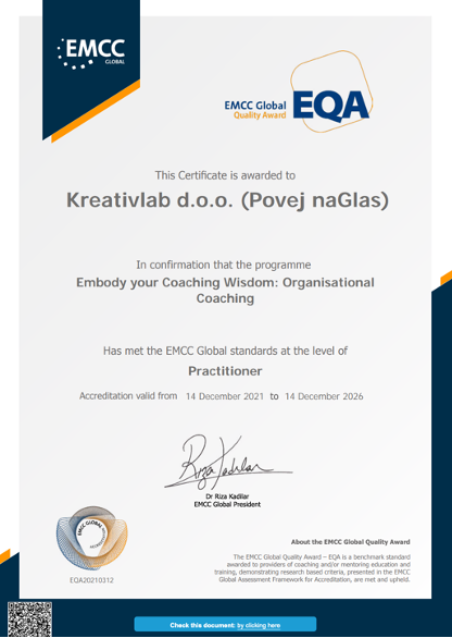 Poleg tega pridobite tudi EQA Practitioner - hitra pot EIA Practitioner" (individualna akreditacija) s strani evropske zveze za coaching in mentorstvo EMCC Global.